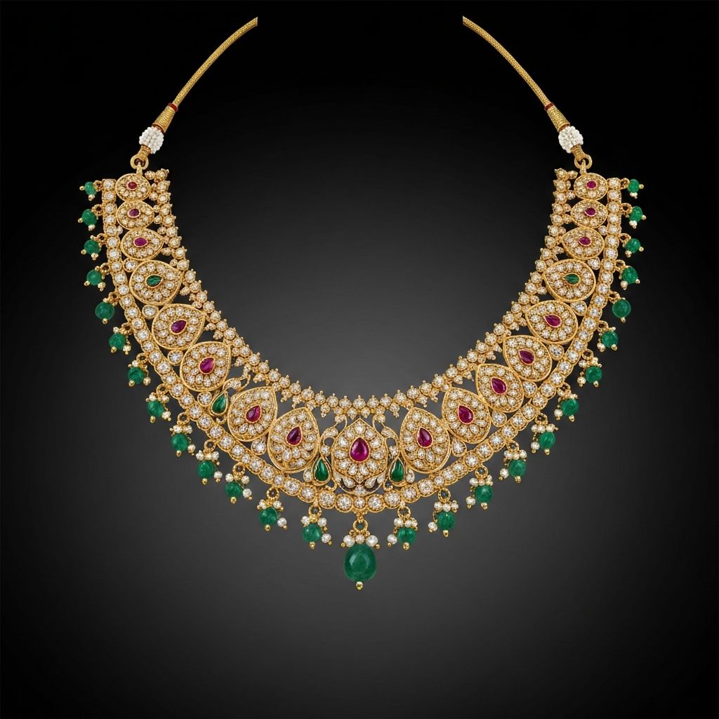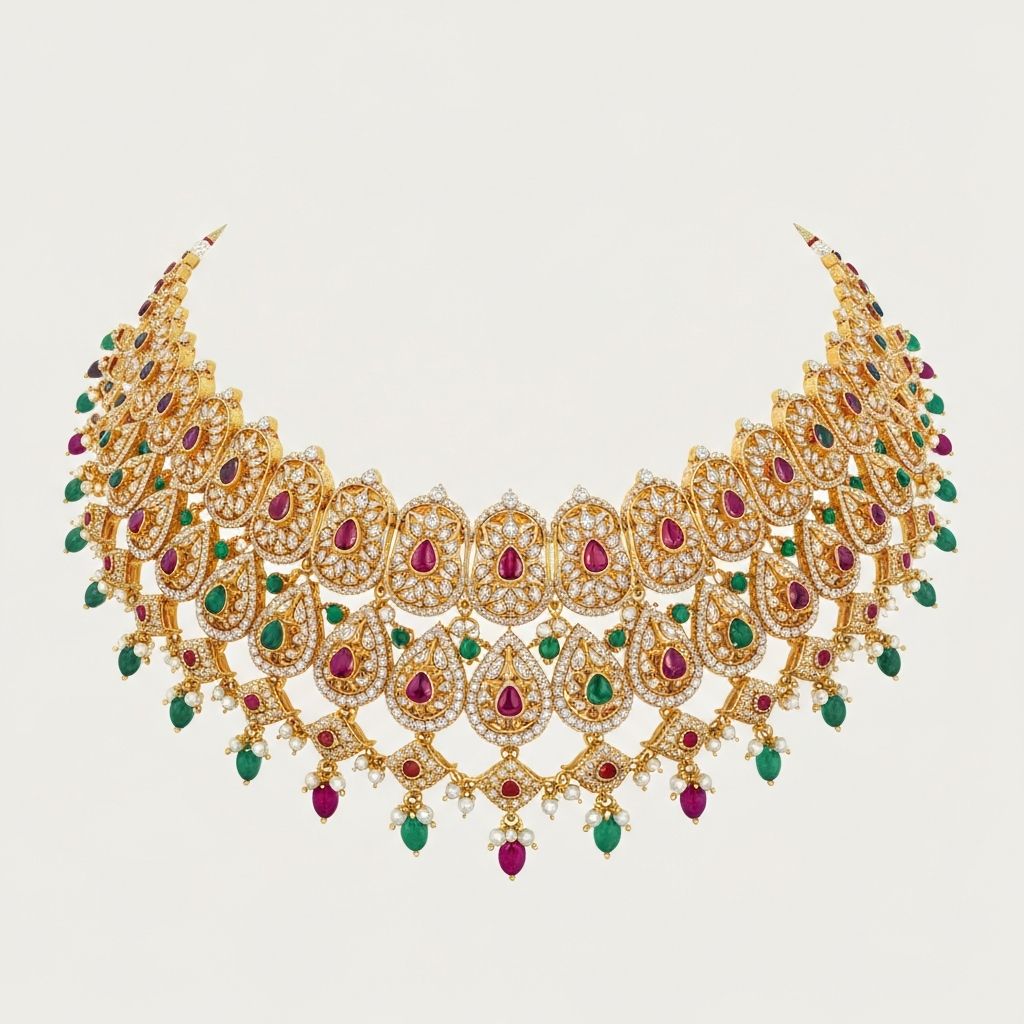 This magnificent bridal piece showcases the pinnacle of Indian jewelry design. The intricate filigree work combined with precious gemstones creates an ethereal masterpiece for life's most cherished moments.
